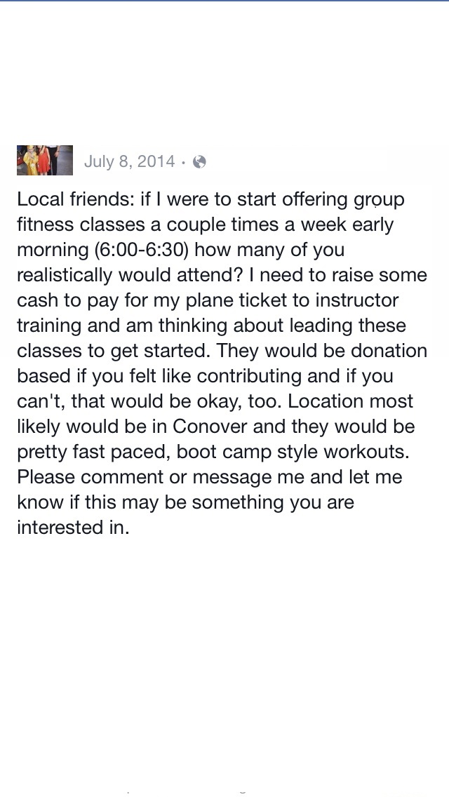 On July 8th, 2014 I posted on Facebook and asked if any of my friends were willing to show up and meet me at a local park for a group workout. The original plan was to collect donations and to earn enough money to pay for my plane ticket to Revelation Wellness Instructor Training.