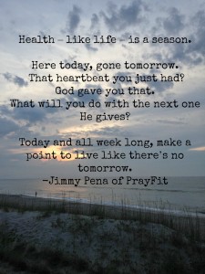 Read MoreI read this by Jimmy Pena of PrayFit and just had to share it with you. “Health – like life – is a season. Here today, gone tomorrow. That heartbeat you just had? God gave you that. What will you do with the next one He gives? Today and all week long, make a point […]