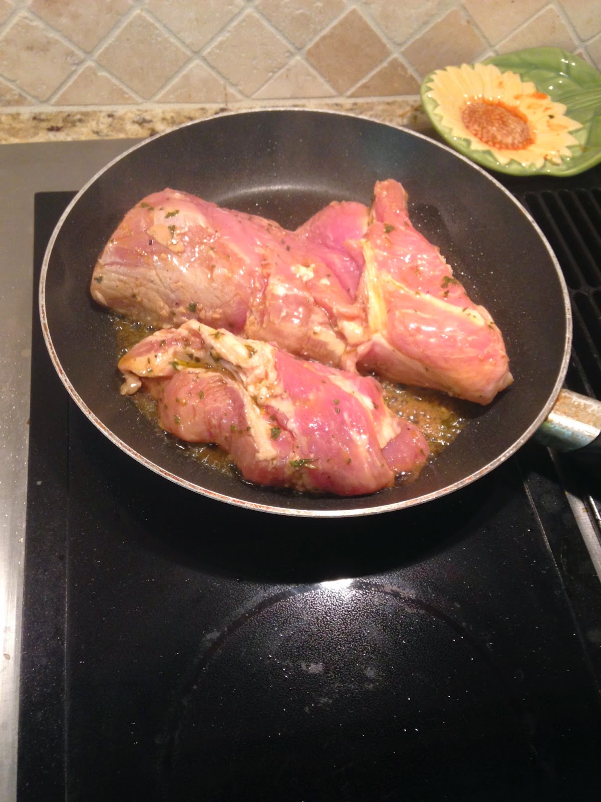 Heat oven to 375. Sear each side of the tenderloin in a skillet on the stovetop for 2-3 minutes.
