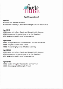 (All-Access members, be sure you check the NEW MONTHLY CONTENT tab of the member website to gain access to all of our monthly materials including the workout calendars, beginner plan, five day a week plan, weekly tracker, scripture writing, Bible study and more!)